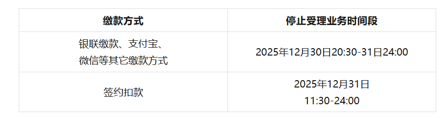 根据中国人民银行国库局国库信息处理系统年终工作时间安排及中国银联股份有限公司广东分公司年终业务受理时间安排,为配合做好2025年年终决算工作,现将年终税费扣款业务受理时间安排通知如下: