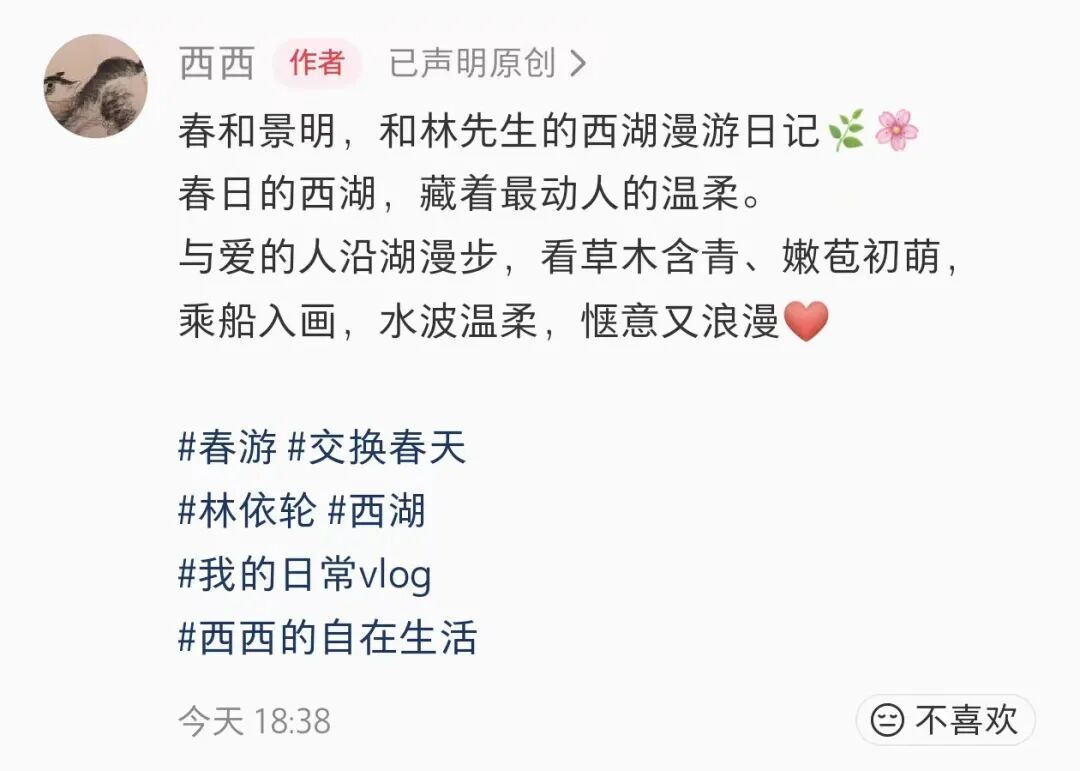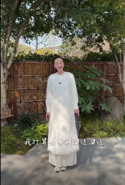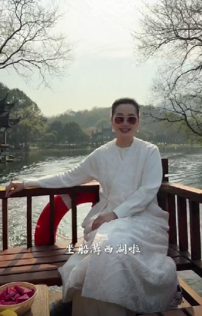 她还配文感叹:“春日的西湖,藏着最动人的温柔。与爱的人沿湖漫步,看草木含青、嫩苞初萌,乘船入画,水波温柔,惬意又浪漫。”