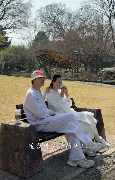 走累了,二人坐在长椅上休息,林依轮贴心地为妻子撑起遮阳伞,还忍不住夸赞:“感受慢生活,杭州就是适合慢生活的地儿,人文建设非常好。”