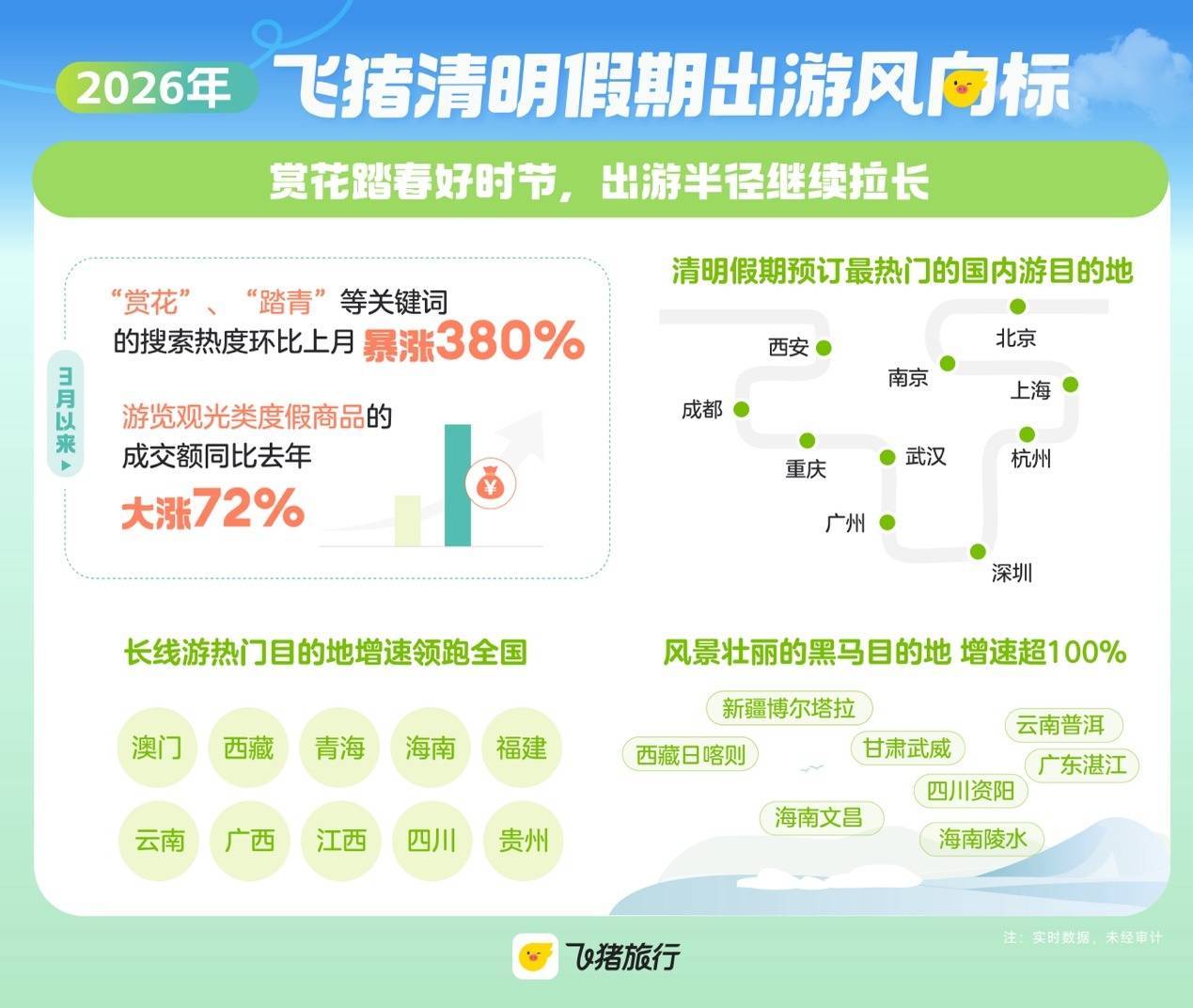 一朵樱花,不仅扮靓了江城春日,更激活了整座城市的文旅消费新活力。接下来的清明假期正值晚樱、郁金香、杜鹃等花卉的盛花期,飞猪旅行数据显示,武汉跻身全国清明假期旅游预订十大热门城市,成为华中地区春游核心目的地,赏花游热度预计将持续攀升。